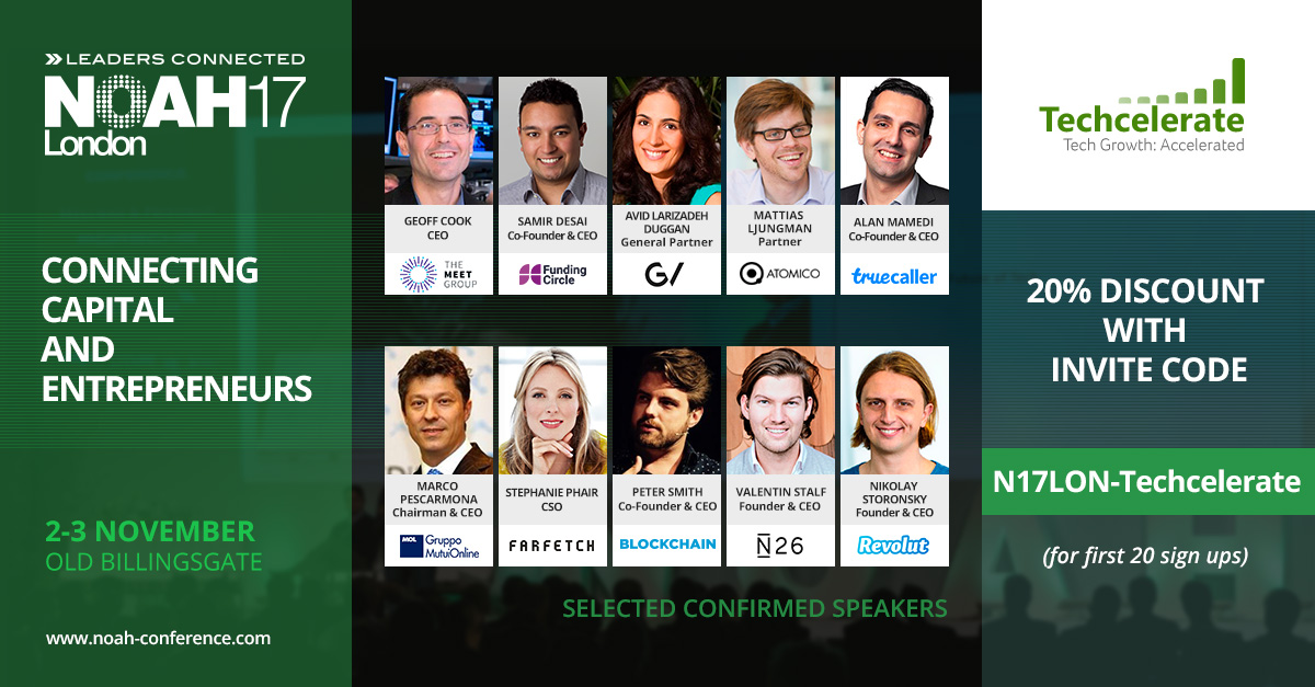 Thanks to Marco (NOAH’s founder), here is the invite code to get 20% off – register here with code N17LON-Techcelerate. See you there!