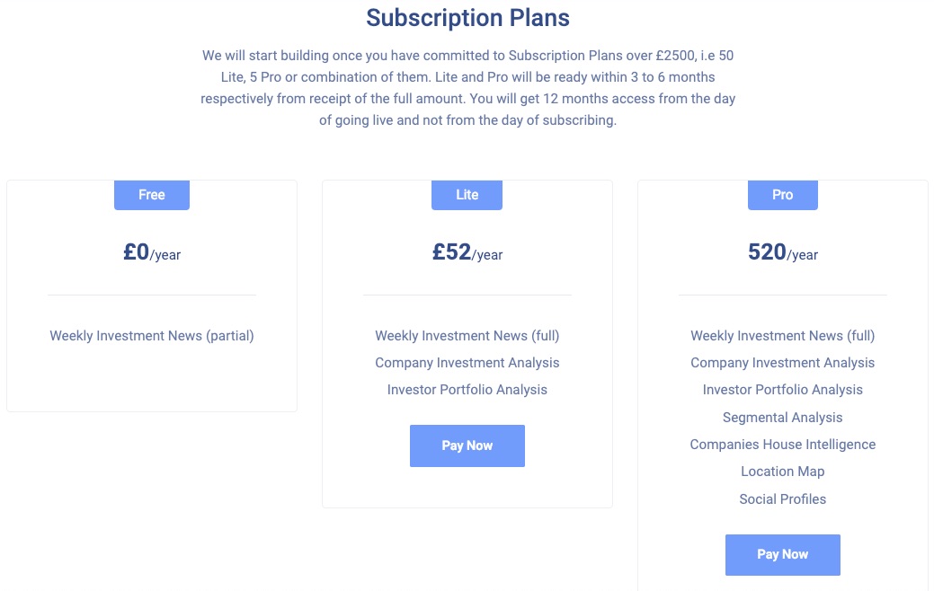 In order to provide you with greater access to the investment data we collect, we are ready to turn the raw data into a format where you can easily filter and analyse. We have two versions in mind, i.e. Lite and PRO. We need the support of 50 subscribers at £52 per year to validate what you already asked for. Be one of the 45 to support us.